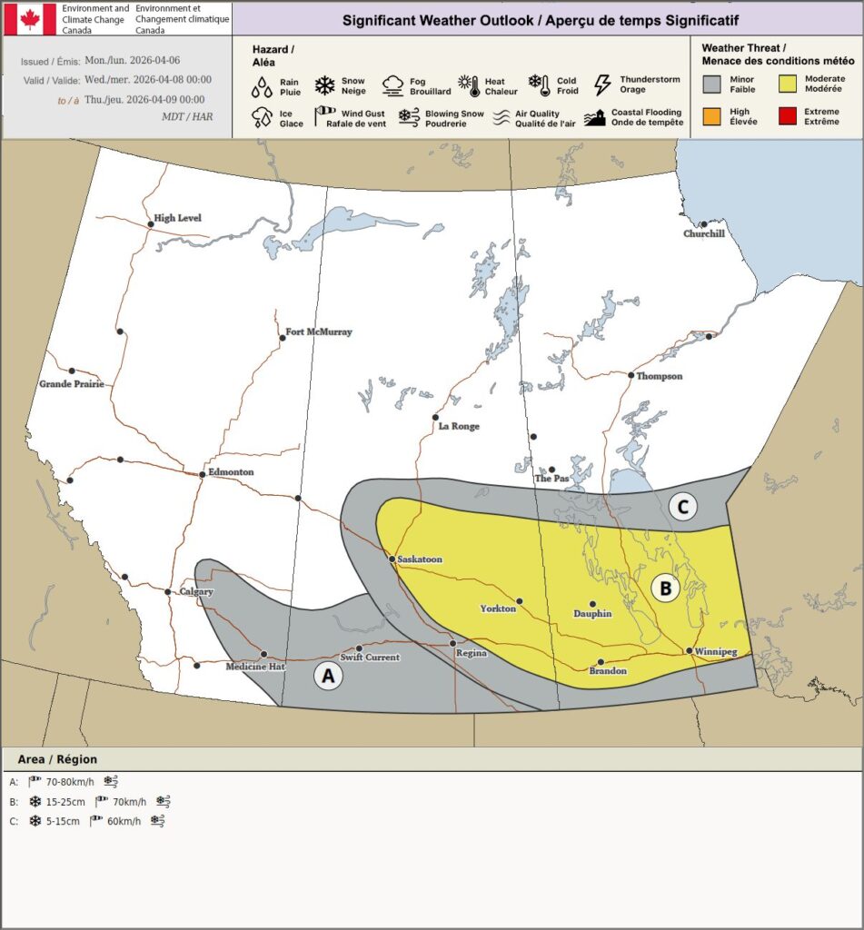 Leons Headlines April 6: A developing AB Clipper may bring 25+ cm of snow Tuesday & Wednesday, with the heaviest band from Swan River through Dauphin & into the Interlake, however updated models now say 25cm could also hit Brandon, Portage and Winnipeg too.