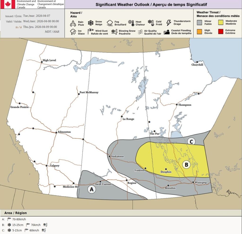 Leons Headlines April 7: Another AB clipper is expected to hit Southern MB late Tuesday into Wednesday, bringing strong winds, and a potentially impactful mix of snow, rain, or both, with heavy snowfall warnings in effect north of the Trans Canada, a Special Weather Statement for the rest of the area & even thundersnow/thundershowers possible.