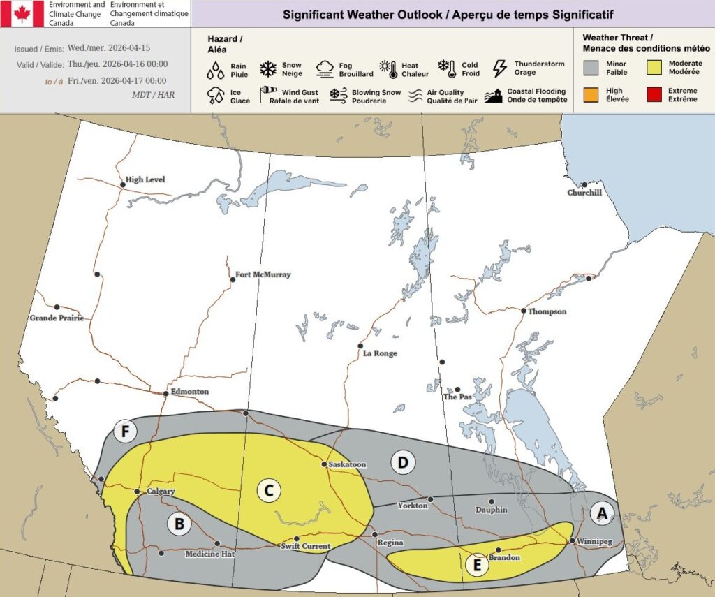 Leons Headlines April 16: Winter storm movies into southern MB today into Friday, bringing snow (4–8 cm, up to 15 cm in higher areas) risk of freezing rain along & south of the Trans-Canada Hwy.